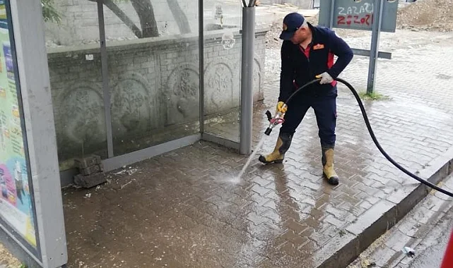 Ağrı'da halkın yoğun olarak kullandığı cadde ve otobüs durakları ekipler tarafından yıkandı.