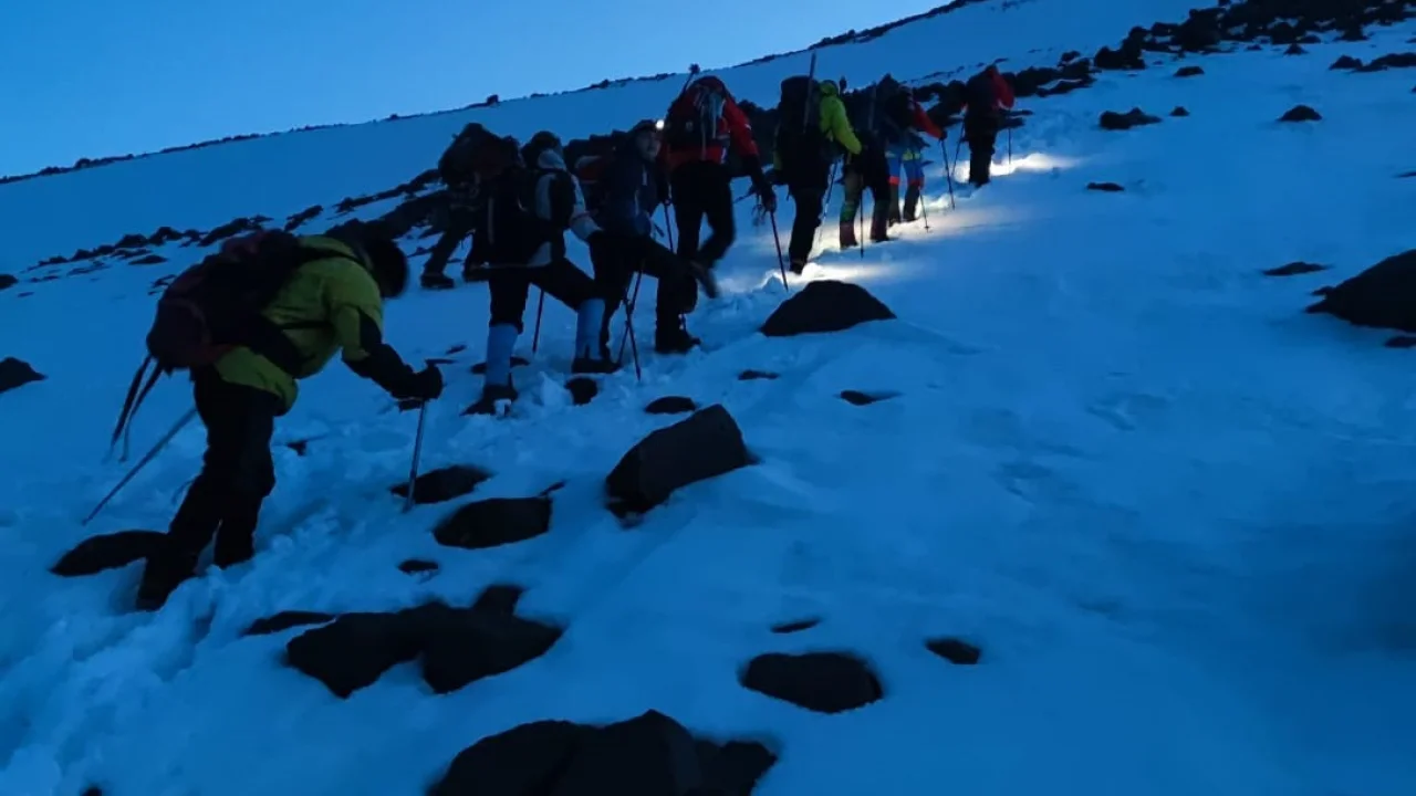 Tırmanış, yerel rehber Cuma Saltık öncülüğünde başladı. Dağcıların karla kaplı zorlu araziye rağmen yürüyüşlerini sürdürdüğü görüldü.