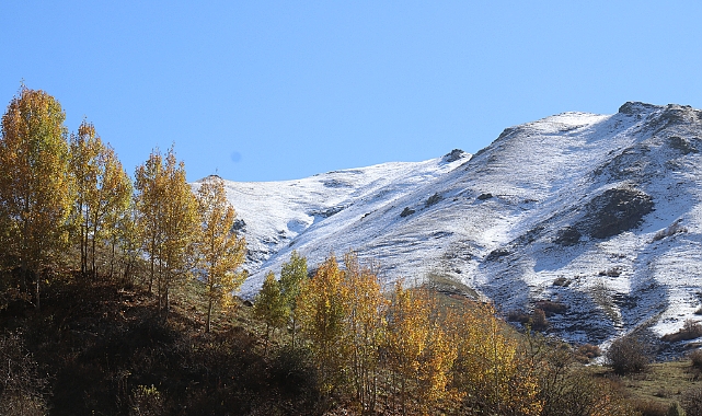 Ağrı'nın Eleşkirt ilçesindeki yüksek rakımlı dağların zirvesi kar yağışıyla beyaza, etekleri ise sonbahar renklerine büründü.