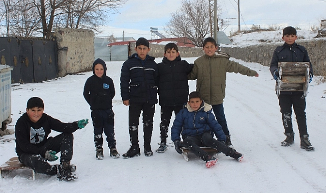 Kar ve tipi nedeniyle eğitime ara verilen Akyaka ilçesinde, çocuklar tahtadan ve bidondan yaptıkları kızaklarla kaydı.
