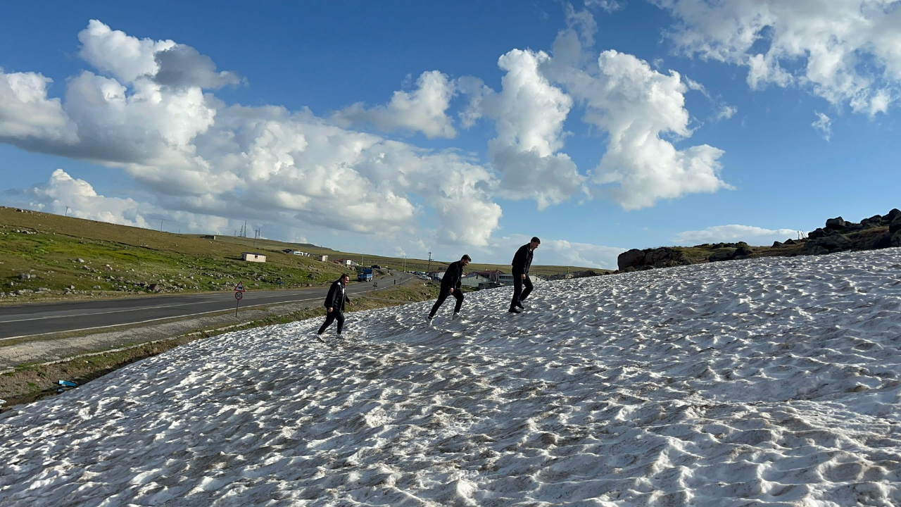 Ziyaretçiler, yaylada hala karla kaplı noktalara çıkarak kar üstünde gezdi, serinlemeye çalıştı.