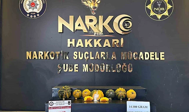Hakkari'nin Yüksekova ilçesinde polis ekipleri tarafından yapılan aramada 7 adet bal kabağı içerisinde zulanlanmış 14 kilo 100 gram metamfetamin ele geçirildi.