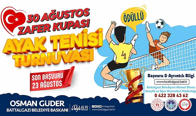 Sosyal ve kültürel alanda birçok aktiviteyi ilçedeki vatandaşlarla buluşturmayı başaran Battalgazi Belediyesi, farklı spor branşında düzenlediği etkinliklerle her yaştan sporseveri bir araya getirmeye devam ediyor. Sağlıklı bir gelecek için herkesimden vatandaşı sporla buluşturmaya devam eden Battalgazi Belediyesi Gençlik ve Spor Hizmetleri Müdürlüğü tarafından 30 Ağustos Zafer Bayramı dolayısıyla ödüllü "Ayak Tenisi Turnuvası"nın startını verdi. Son başvuru tarihinin 23 Ağustos Çarşamba günü olan bu özel turnuva, büyük rekabete ve heyecana sahne olacak.