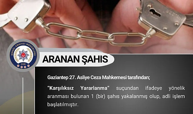 Bingöl'de huzur ve güvenliğin sağlanması için İl Emniyet Müdürlüğü ekipleri, gece gündüz demeden çalışmalarını sürdürüyor. Bu çerçevede ekiplerce yapılan çalışmada, çeşitli suçlardan aranması bulunan 3 şüpheli yakalanarak gözaltına alındı. Şüpheliler hakkında adli işlemlerin sürdüğü bildirildi.
