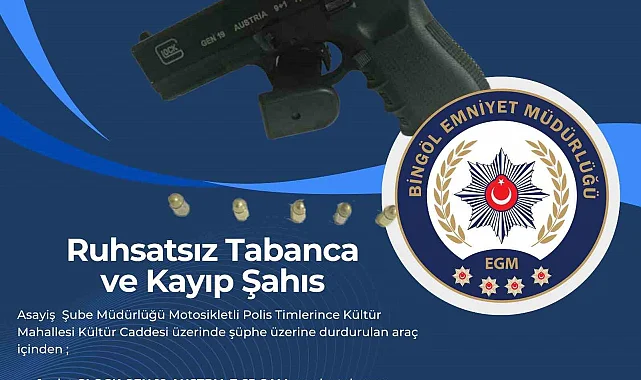 Bingöl İl Emniyet Müdürlüğü Asayiş Şube Müdürlüğü Motosikletli Polis Timlerince, Kültür Mahallesi Kültür Caddesi üzerinde şüphe bir araç durduruldu. Yapılan aramada, 1 adet ruhsatsız silah, 1 adet şarjör ve 5 adet fişek ele geçirildi. Şüpheli 2 şahıs hakkında adli işlem başlatıldığı bildirdi.