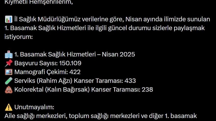 Bingöl Valisi Dr. Hamdi Usta, İl Sağlık Müdürlüğü verilerini paylaştı. Verilere göre Nisan ayında kentte sunulan 1. Basamak Sağlık Hizmetlerine 150 bin 109 başvuru alındı. Başvurulardan bin 93 kişinin kanser taraması yapıldığı bildirildi.