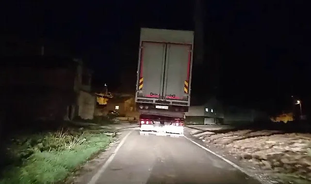 Dün akşam saatlerinde dar yoldan geçen kamyon yüklü çekici, yolda seyreden vatandaşlara korku dolu anlar yaşattı. Sağlıklı olmayan yolda güçlükle ilerleyebilen çekici, cep telefonu ile görüntülendi.