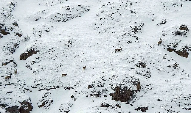 Erzincan'da Munzur Dağlarının karlı zirvelerinde dağ keçileri görüntülendi.