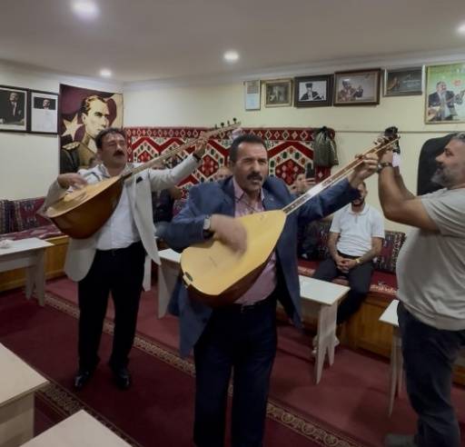 Fotoğraf 2:ÖndeÂşık Sabri Yokuş, arkada Âşık Gültekin Bulutoğlu, Fotoğraf: Doç. Dr. Sibel Polat, Kars Âşıkları Kültür Evinde turistlere aşık dinletisi yaparken aşığın sazına para asma geleneğine dair bir görüntü. 05 Ağustos 2025, Kars.
