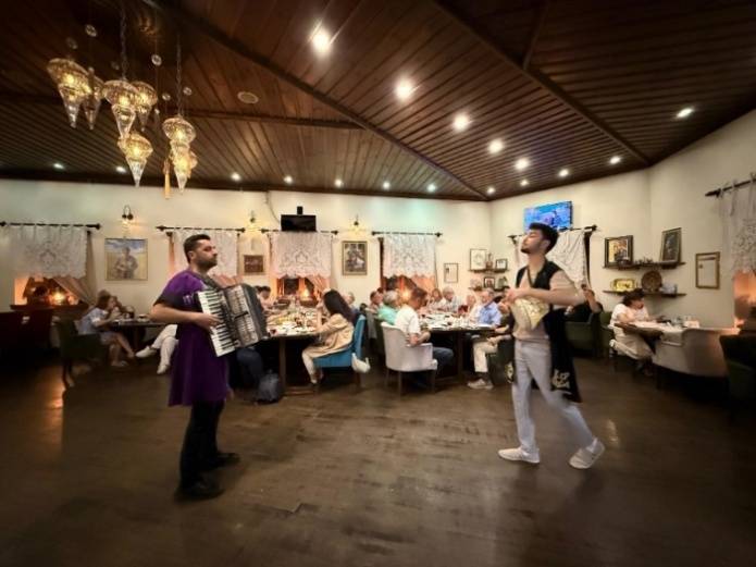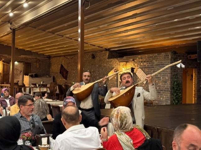Fotoğraf 7: Akordeon çalan mahalli sanatçı Burak Ulubey ile darbuka çalan mahalli sanatçı Kadir Salduz’un turistlere müzik dinletisi yaptığı program. Fotoğraf: Doç. Dr. Sibel Polat, Kaz Evi, 19 Ağustos 2025, Kars.