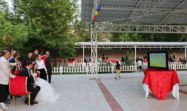 Erzurum'un Oltu ilçesinde dünya evine giren çift, düğünleri milli maç saatine denk gelince eğlenceye 90 dakikalık ara verdiler.