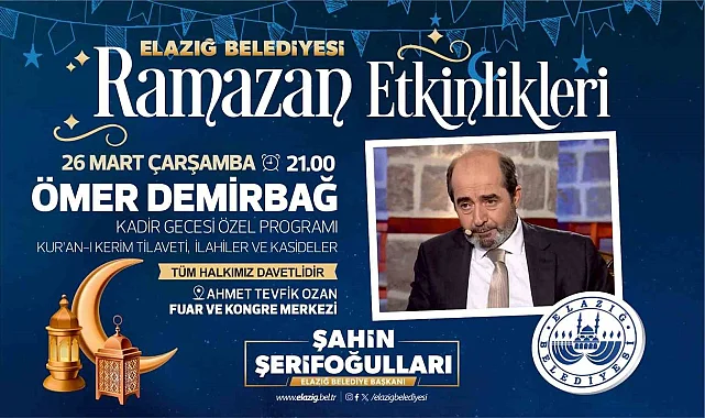 Elazığ Belediyesi Basın-Yayın ve Halkla İlişkiler Müdürlüğü tarafından yapılan açıklamada, "Ahmet Tevfik Ozan Fuar ve Kongre Merkezinde Ramazan ayının manevi iklimini geniş kitlelerle buluşturduğumuz Ramazan ayı etkinlikleri kapsamında 26 Mart Çarşamba günü, saat 21.00'de Kadir Gecesi özel programı düzenlenecektir. Kıymetli hocamız Dr. Ömer Demirbağ'ın sohbetiyle konuk olacağı programa tüm halkımız davetlidir" denildi.