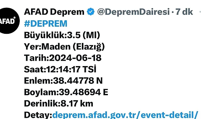 AFAD'dan yapılan açıklamada, merkez üssü Maden ilçesinde yerin 8 kilometre altında 3.5 büyüklüğünde deprem meydana geldi. Deprem nedeni ile herhangi bir olumsuzluğun yaşanmadığı öğrenildi.