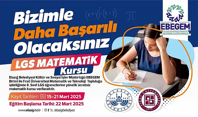Elazığ Belediyesi, Liselere Geçiş Sistemi (LGS) sınavına hazırlanan öğrencilere destek olmak amacıyla 'Bizimle Daha Başarılı Olacaksınız' sloganıyla ücretsiz matematik kursu düzenleyecek.
