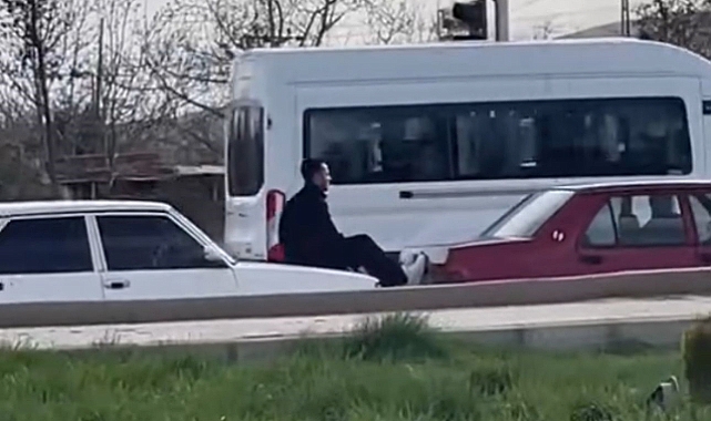 Görüntülerde olayın yaşandığı sırada, kaputta oturan kişinin hiçbir güvenlik önlemi almadan ve oldukça tehlikeli bir şekilde hareket ettiği görüldü. Kaput üzerindeki kişinin, adeta bir halat gibi araç ile önündeki aracı hareket ettirdiği görüldü.