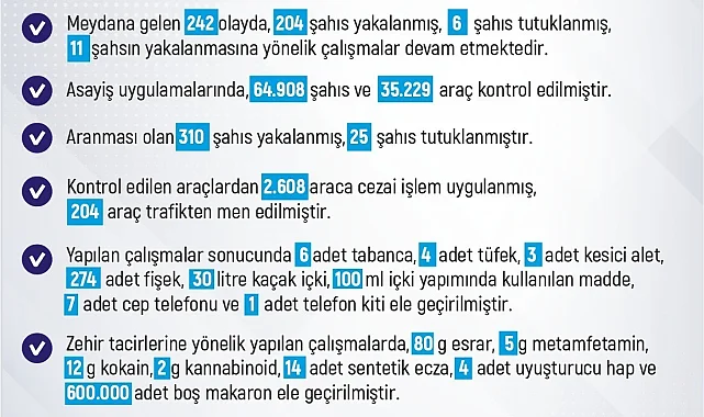 Yapılan çalışmalar sonucunda 6 adet tabanca, 4 adet tüfek, 3 adet kesici alet, 274 adet fişek, 30 litre kaçak içki, 100 milimetre içki yapımında kullanılan madde, 7 adet cep telefonu ve 1 adet telefon kiti ele geçirildi. Zehir tacirlerine yönelik yapılan çalışmalarda ise 80 gram esrar, 5 gram metamfetamin, 12 gram kokain, 2 gram kannabinoid, 14 adet sentetik ecza4 adet uyuşturucu hap ve 600 bin adet boş makaron ele geçirildi.