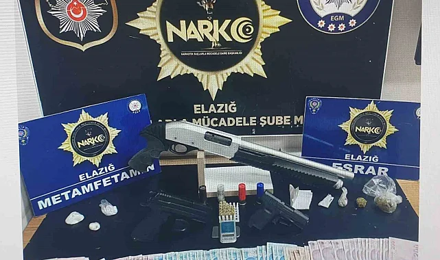 Elazığ Cumhuriyet Başsavcılığı koordinesinde İl Emniyet Müdürlüğü Narkotik Suçlarla Mücadele Şube Müdürlüğü ekipleri tarafından, uyuşturucu ile mücadele çerçevesinde sokak satıcılarına yönelik uygulama gerçekleştirildi. Yapılan çalışmalarda V.Ç. ve S.E. isimli şahısların yapılan üst ve ikamet aramasında 2 parça halinde toplam 15 gram esrar maddesi, 3 parça halinde toplam 11,12 gram metamfetamin, 2 adet sentetik ecza, 2 adet 7.65 çapında tabanca ve tabancalara ait 23 adet fişek, 1 adet pompalı tüfek ve 4 adet kartuş, 1 adet sallama tabir edilen kesici alet, 1 adet hassas terazi, 14 bin 880 lira ele geçirildi.
