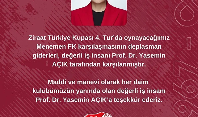 Bordo-beyazlı ekibin deplasmanda Menemen FK ile oynayacağı Ziraat Türkiye Kupası 4. tur maçının deplasman giderleri iş kadını Prof. Dr. Yasemin Açık tarafından karşılandı.