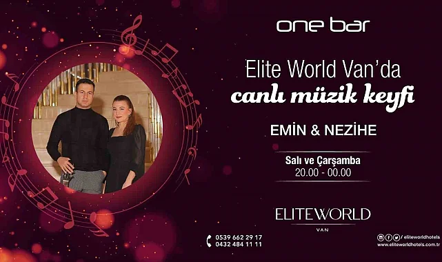 Konuyla ilgili açıklamada bulunan Elite World Van Hotel Genel Müdürü Oktay Aksoy, misafirlerine hizmetin en güzelini sunmak amacıyla haftanın iki günü canlı müzik hizmeti sunduklarını ifade ederek, "Gün boyunca yoğun bir tempo yaşayan misafirlerimizin bu yorgunluklarını atmalarını sağlamak amacıyla One Bar'da canlı müzik ziyafeti sunuyoruz" dedi.