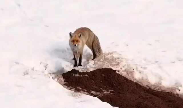 Erzincan'ın doğasına renk katan tilki, karlı arazide yuvasından çıkarken drone ile havadan görüntülendi.