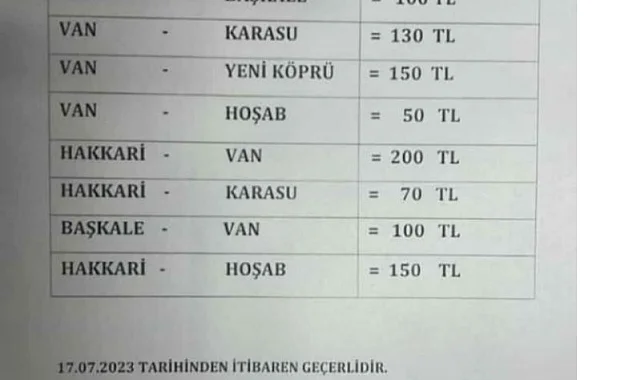 Hakkari-Van arasında 130 TL olan yolcu ücreti 200 TL'ye çıkartıldı.