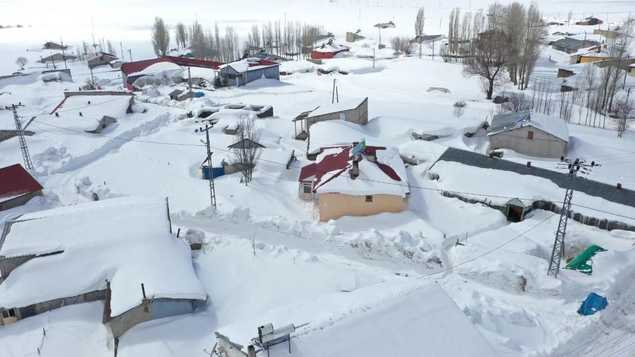Baharda kışın yaşandığı, ev ve ahırların kardan kaybolduğu köyler, AA ekibince dronla görüntülendi.
