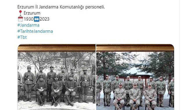 Jandarma Genel Komutanlığı'nın resmi sosyal medya hesabında yapılan bir paylaşım takipçilerini hem duygulandırdı hem de gurur verdi. 1930 yılında Erzurum'da 11 jandarma personelinin çekilen fotoğrafının benzeri şekilde günümüz jandarma personeli ile yine 11 personel ile çekilmiş fotoğraf karesi bir arada paylaşıldı. Erzurum İl Jandarma Komutanlığı personelinin 93 yıl önceki duruşun aynısını sergilemesi dikkatlerden kaçmadı. "Ruh aynı ruh, İnanç aynı inanç" notu düşülen paylaşıma binlerce beğeni ve yorum geldi.
