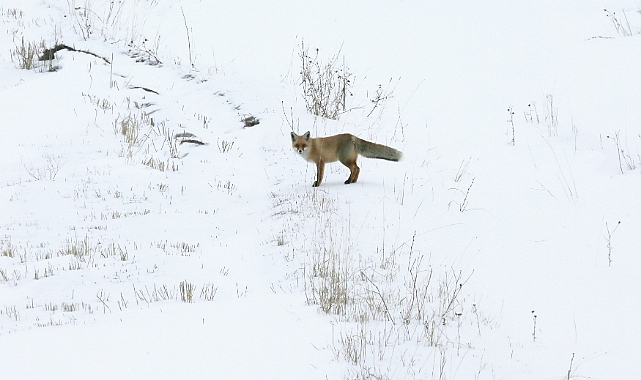 Yiyecek bulmak için Kars-Çıldır ve Kars-Digor kara yolu yakınlarında avlanan kızıl tilkiler, dakikalarca sesleri dinleyerek avını yakalamaya çalıştı.