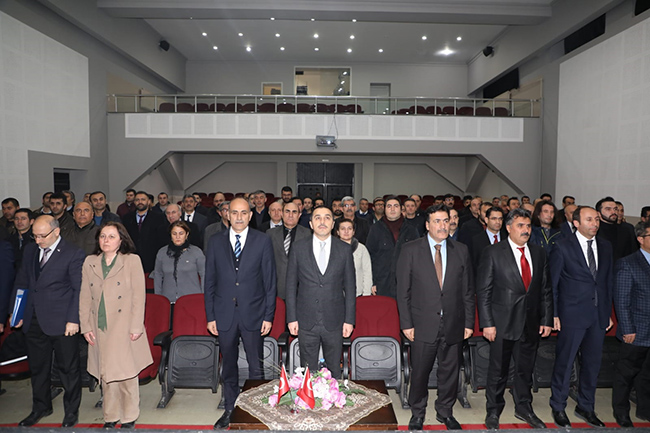 Saygı duruşu ve İstiklal Marşının okunmasıyla başlayan toplantıda, İl Milli Eğitim Müdürlüğü, Fen Lisesi, Alparslan Anadolu Lisesi, Anadolu İmam Hatip Lisesi ve Fevzi Paşa Ortaokulu tarafından Milli Eğitim Eylem Planı kapsamında yapılan çalışmalarla ilgili olarak sunum yapıldı.