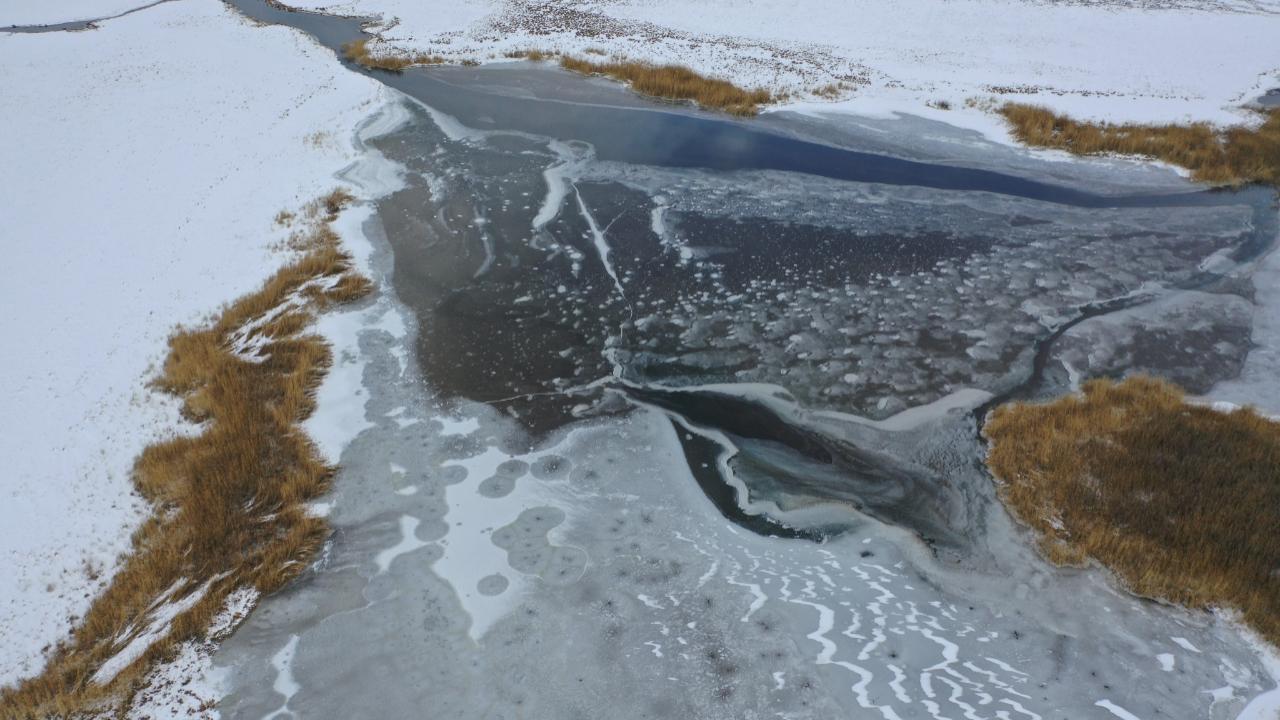 Kars'ın Arpaçay ilçesinde etkili olan soğuk hava nedeniyle "kesin korunacak hassas alan" olarak tescillenen Lavaş Gölü'nün yüzeyi dondu.