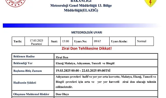 Meteoroloji 13. Bölge Müdürlüğü'nden yapılan açıklamada, "Elazığ, Malatya, Adıyaman, Tunceli ve Bingöl için 19.03.2025 - 22.03.2025 tarihleri arasından zirai don hadisesi beklenmektedir. Adıyaman çevreleri hafif ve yer yer orta kuvvette, Malatya, Elazığ, Tunceli ve Bingöl çevreleri için orta ve yer yer kuvvetli zirai don olacağı tahmin edilmektedir. Oluşması muhtemel risklere karşı tedbirli ve dikkatli olunması gerekmektedir" denildi.