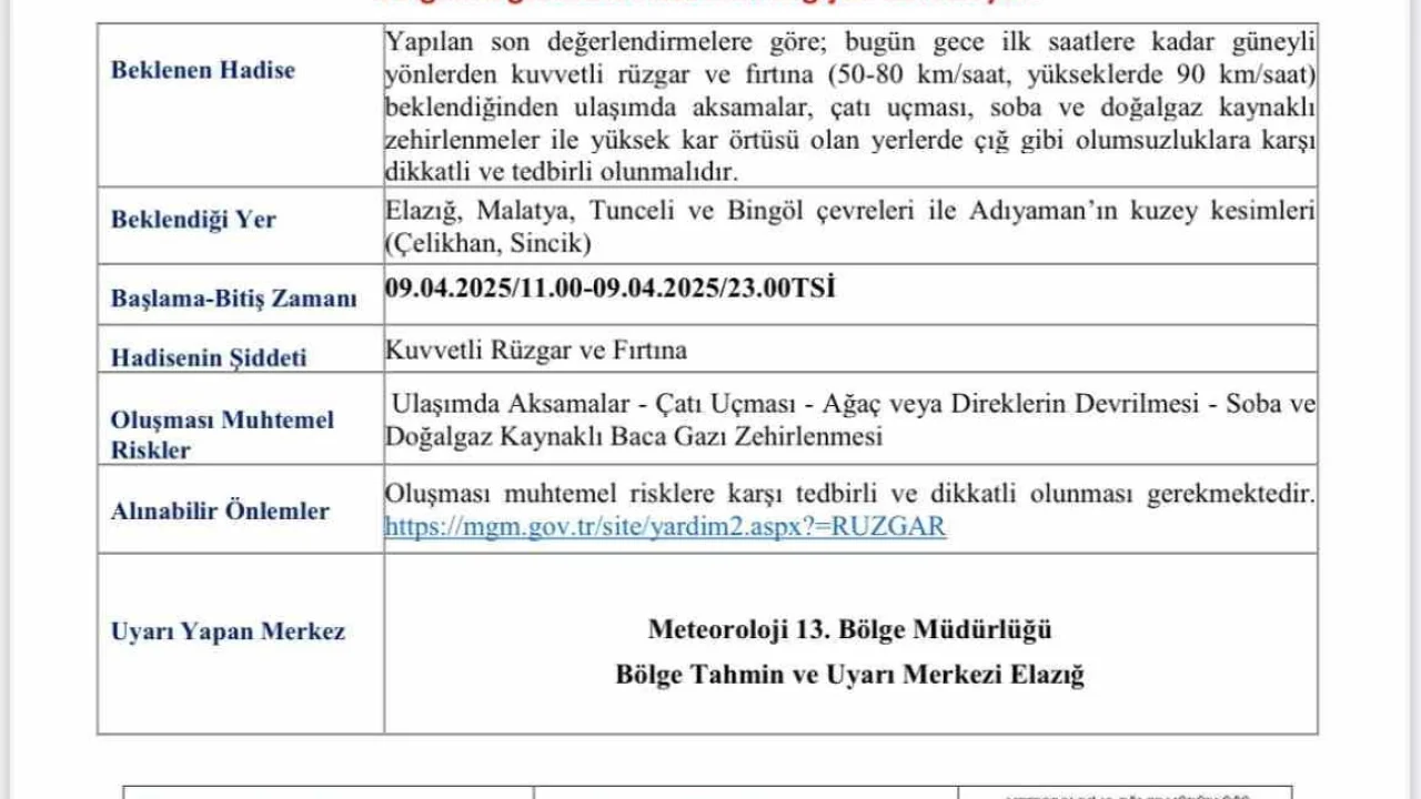 Çevre Şehircilik ve İklim Değişikliği Bakanlığı Meteoroloji Genel Müdürlüğü 13. Bölge Müdürlüğü tarafından Elazığ ve bölgesi için kuvvetli rüzgar ve fırtına uyarısında bulunuldu. Açıklamada, ‘’Yapılan son değerlendirmelere göre bugün gece ilk saatlere kadar güneyli yönlerden kuvvetli rüzgar ve fırtına (50-80 km/saat, yükseklerde 90 km/saat) beklendiğinden ulaşımda aksamalar, çatı uçması, soba ve doğalgaz kaynaklı zehirlenmeler ile yüksek kar örtüsü olan yerlerde çığ gibi olumsuzluklara karşı dikkatli ve tedbirli olunmalıdır. Bölgemizdeki beklenen sağanak ve gök gürültülü sağanak yağışlı toz taşınımı ile birlikte yer yer çamur şeklinde yağış görüleceği tahmin ediliyor’’ denildi.
