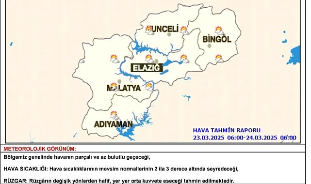Meteoroloji 13. Bölge Müdürlüğü'nden yapılan açıklamada, "Hava sıcaklıklarının mevsim normallerinin 2 ila 3 derece altında seyredeceği, Elazığ, Malatya, Tunceli ve Bingöl çevreleri ile Adıyaman'ın kuzey kesimlerinde hafif kuvvette zirai don beklendiğinden tarımsal faaliyetlerle uğraşan vatandaşlarımızın zirai dona karşı dikkatli ve tedbirli olması önem arz etmektedir" denildi.