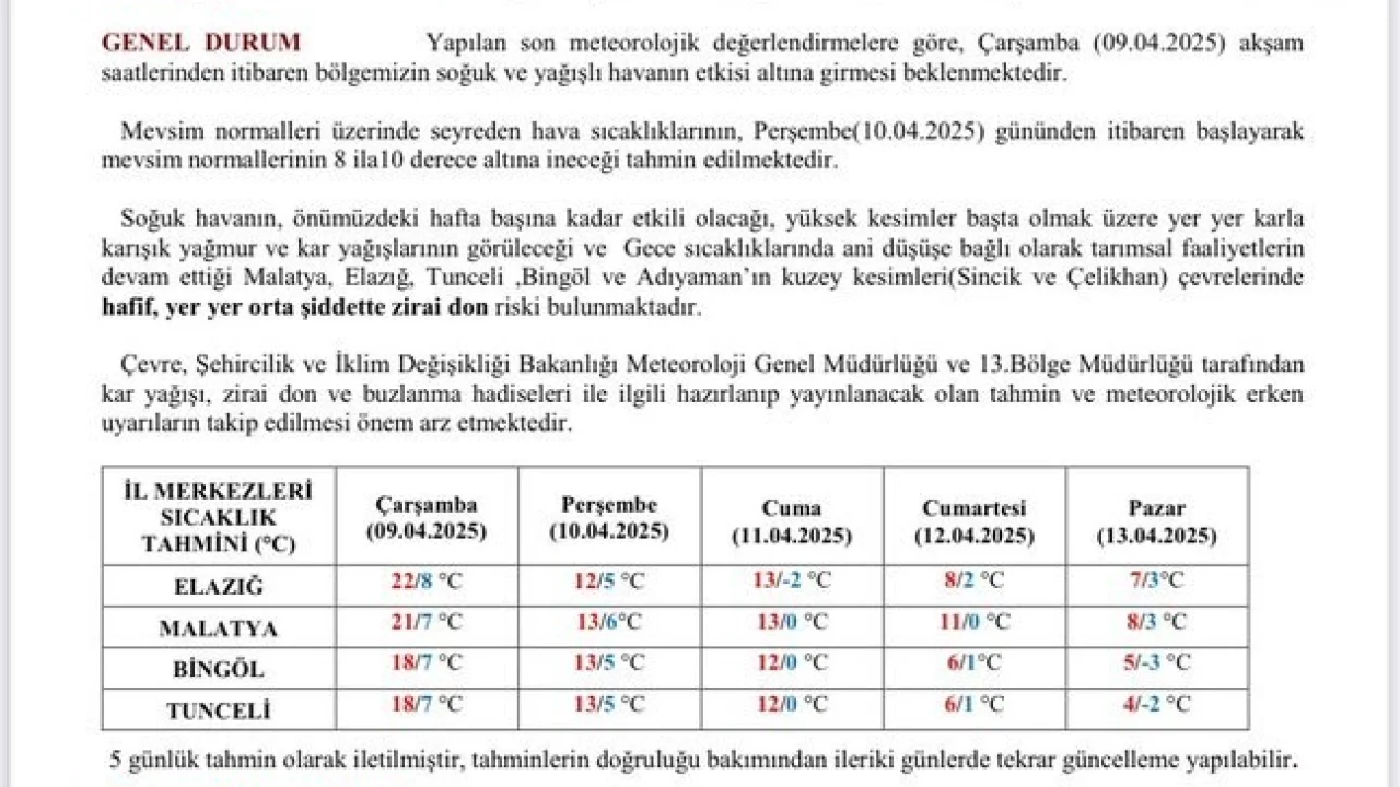 Meteoroloji 13. Bölge Müdürlüğü’nden yapılan açıklamada, "Yapılan son meteorolojik değerlendirmelere göre, Çarşamba (09.04.2025) akşam saatlerinden itibaren bölgemizin soğuk ve yağışlı havanın etkisi altına girmesi beklenmektedir. Mevsim normalleri üzerinde seyreden hava sıcaklıklarının, Perşembe (10.04.2025) gününden itibaren başlayarak mevsim normallerinin 8 ila10 derece altına ineceği tahmin edilmektedir. Soğuk havanın, önümüzdeki hafta başına kadar etkili olacağı, yüksek kesimler başta olmak üzere yer yer karla karışık yağmur ve kar yağışlarının görüleceği ve Gece sıcaklıklarında ani düşüşe bağlı olarak tarımsal faaliyetlerin devam ettiği Malatya, Elazığ, Tunceli, Bingöl ve Adıyaman’ın kuzey kesimleri(Sincik ve Çelikhan) çevrelerinde hafif, yer yer orta şiddette zirai don riski bulunmaktadır. Çevre, Şehircilik ve İklim Değişikliği Bakanlığı Meteoroloji Genel Müdürlüğü ve 13.Bölge Müdürlüğü tarafından kar yağışı, zirai don ve buzlanma hadiseleri ile ilgili hazırlanıp yayınlanacak olan tahmin ve meteorolojik erken uyarıların takip edilmesi önem arz etmektedir. Ulaşımda aksamalar,buzlanma ve don olayı, olaylara karşı dikkatli ve tedbirli olunmalıdır. Meteoroloji Genel Müdürlüğü tarafından gerek görüldükçe hazırlanacak olan anlık meteorolojik uyarıların takibini yaparak, oluşması muhtemel risklere karşı can ve mal emniyeti açısından dikkatli ve tedbirli olunması önem arz etmektedir" denildi.