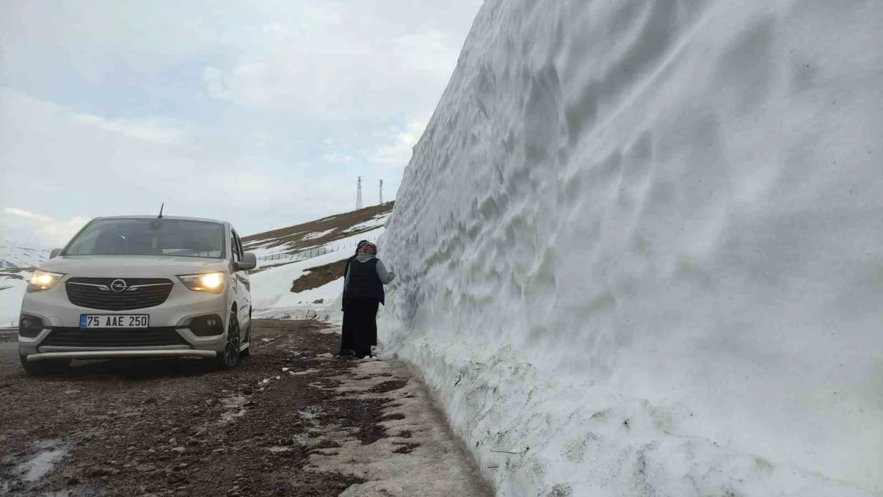 Ardahan-Şavşat karayolu üzerinde deniz seviyesinden 2 bin 540 metre yükseklikteki Sahara geçidinin çığ geleneler Mevkii’nde yaklaşık 4 metre boyunda kar var. Karayolunu kullanan sürücüler bu bölgede durarak hatıra fotoğrafı çekiyor.