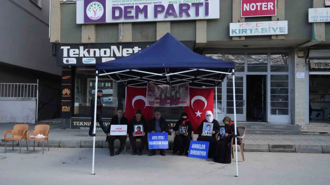 Muş’ta çocukları terör örgütü PKK tarafından kaçırılan aileler, DEM Parti İl Başkanlığı önündeki eylemlerine devam ediyor.
