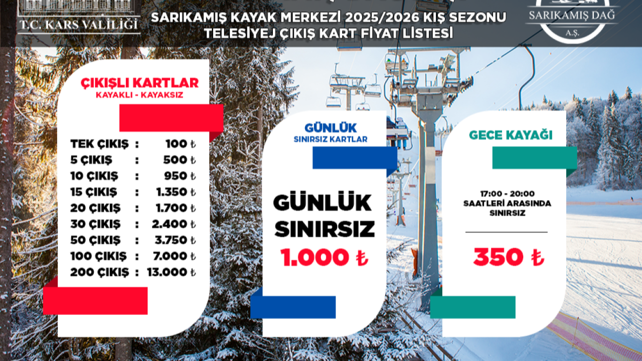 Kayakseverleri ağırlayacak Sarıkamış Kayak Merkezinde, Sarıkamış Dağ A.Ş. tarafından belirlenen 2025–2026 kış sezonu telesiyej fiyat tarifesi fiyatları da açıklandı.