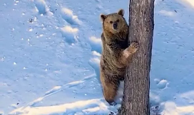 Görüntülerde, Kars'ın Sarıkamış ilçesinde sarıçam ağaçları arasında kış uykusundan uyanır uyanmaz devasa boz ayının ustalıkla ağacın gövdesine sarılarak hızla yukarı tırmandığı görüldü. Ayının hareketi vatandaşları gülümsetti.