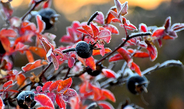 Hava sıcaklığının gece sıfırın altında düştüğü Sarıkamış’ta bitkiler kırağı tuttu.