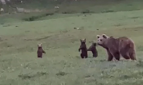 Vatandaşın cep telefonuna yansıyan görüntülerde, aracı gören anne ayı ve 3 yavrunun koşması, yavruların koşarken ayağa kalkarak araca bakması yer alıyor. Anne ayı ve yavrularının belgesel tadındaki görüntüleri anbean kaydedildi.