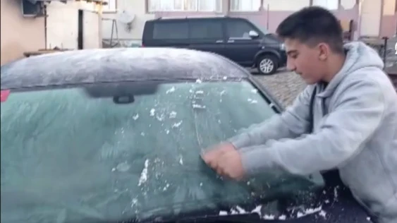 İlçede aralıklarla etkili olan dolu ve sağanak yerini soğuk havaya bıraktı. Soğuk hava nedeniyle araçların camlarının buzla kaplandığı ilçede, vatandaşlar buz tutan camları temizledi.