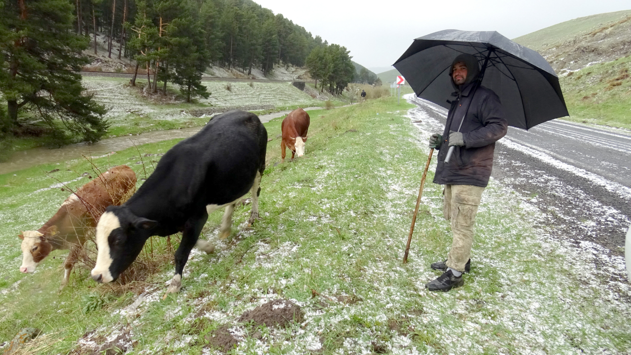 Dağlık bölgelerde hayvanlarını otlatan besiciler, dolu nedeniyle zor anlar yaşadı.