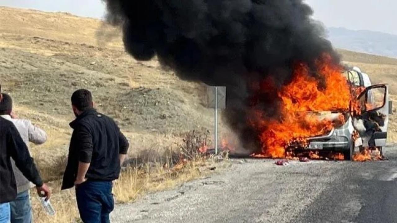 Van'da seyir halindeki bir minibüs, yolun ortasında yanarak kullanılamaz hale geldi.