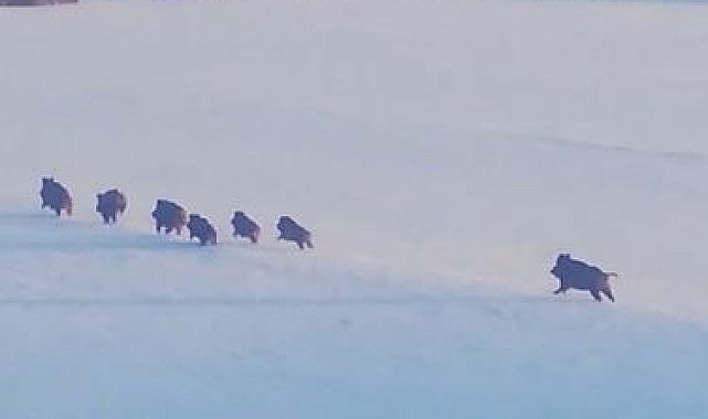 Ardahan'da zaman zaman kara yoluna kadar inen yaban domuzları bu kez karla kaplı Ardahan ovasında ormanlık alana giderken sürü halinde görüntülendi. Ardahan merkeze bağlı Edegül ve Dedegül köyleri arasında bulunan karla kaplı arazide ilerleyen domuzlar, yoldan geçen vatandaşlarca cep telefonu kamerasıyla görüntülendi.