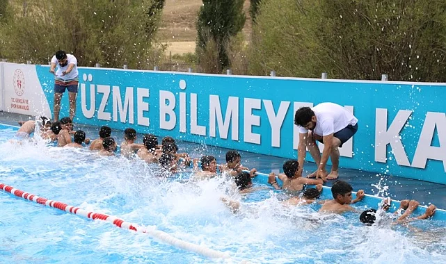 Ağrı'nın Taşlıçay ilçesinde, Gençlik ve Spor Bakanlığı'nın "Yüzme Bilmeyen Kalmasın" projesi kapsamında kurulan portatif havuz, gençlere yüzme öğrenme fırsatı sunuyor.