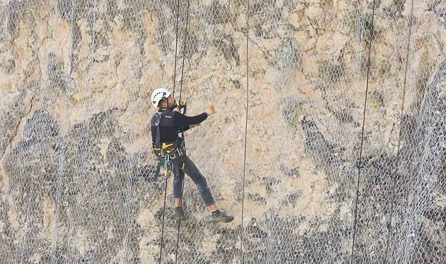 Özel bir firmaya bağlı ekipler halatlar yardımıyla tırmandıkları yamaçlarda riskli kayaları düşürerek çelik ağın yamaca sabitlenmesi için belirlenen noktaya delik açtı.