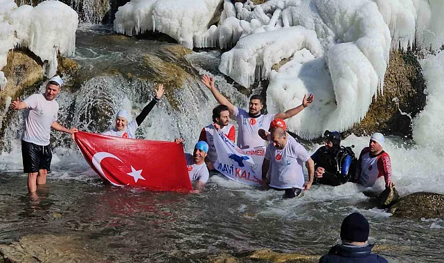 Van'ın kış turizmine dikkat çekmek için hava sıcaklığının eksi 6 dereceyi gördüğü bölgede Van Gölü Aktivistleri Derneği üyeleri, dondurucu soğuğa rağmen şelaleye girerek eğlenceli dakikalar geçirdi.