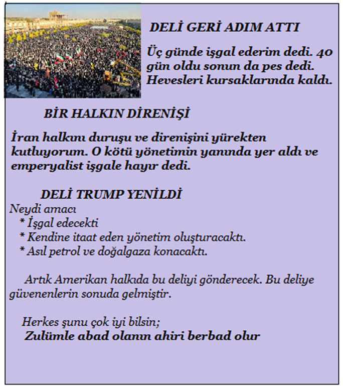 Bir deli bir kuyuya bir taş atar, kırk akıllı çıkaramaz. İşte tam onu yaşıyoruz. ABD nin başına bir deli başkan oldu. Tam bir cahil. Hiçbir konuda becerisi olmayan bu deli ülkelerin kaderi ile oynuyor. Akıl almaz bir şekilde haddine düşmeyen işler yapıyor. Epstein’inin dostu ve o ahlaksızlığın baş sorumlusu olan bu adam tam bir çılgın.