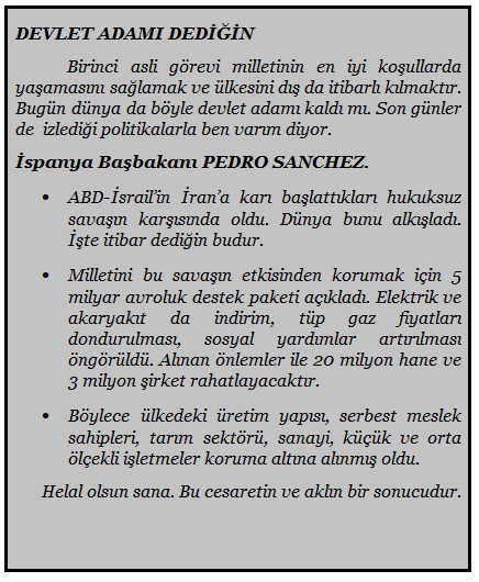 İşte haksız ve hukuk bir şekilde İran’a saldırdı. Uluslararası hukuka aykırı bir savaş açtı. Bu savaşın dünya ülkelerine faturası ağır oldu. Çünkü petrol fiyatları sürekli artmaya başladı. Ekonomisi bozuk olan ülkeler bundan daha fazla etkilendi. En fazlada bizi etkilendik.