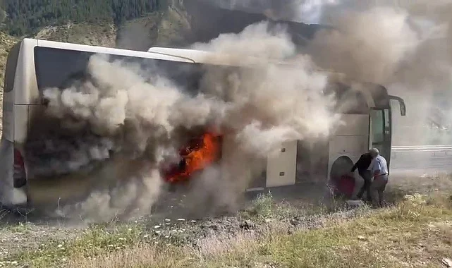 Erzurum'un Oltu ilçesinde yolcu otobüsü yolda seyir halindeyken alev aldı, otobüs kül oldu.